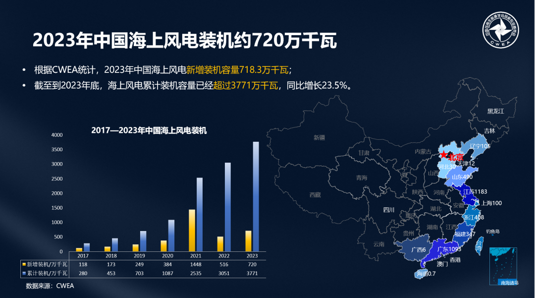 “十四五”前期,我国实现了海上风电稳步发展,CWEA数据显示,2023年度海上风电新增装机容量718.3万千瓦,累计装机容量已经超过3771万千瓦,同比增长23.5%。