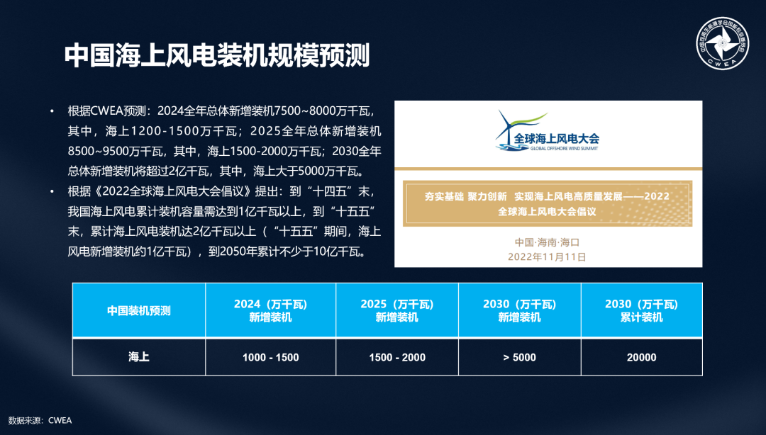 CWEA研究显示,海上风电规划发展潜力巨大,“十四五”期间,中国沿海地区海上风电规划容量约5500万千瓦。预计2024全年总体新增装机7500~8000万千瓦,其中,海上1200-1500万千瓦;2025全年总体新增装机8500~9500万千瓦,其中,海上1500-2000万千瓦;2030全年总体新增装机将超过2亿千瓦,其中,海上大于5000万千瓦。