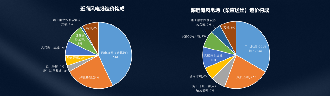 上图可以看出,近海风电场风电机组在总投资中占比最高,随着海上风电向深远海开发,设备投资占比逐步降低,风机基础等建筑工程占比逐步提升;在漂浮式风电场中主要设备占比已低于风机基础。另外,在深远海风电场采用柔性直流输电后,海上及陆上换流站、高压海缆路由的占比明显提高。其中,占比较大的机组价格下降幅度较大,2024年5月,华能半岛北L场址海上风电项目,单机12-14MW,含塔筒的折合单价已经到了3000元左右每千瓦左右的价格。