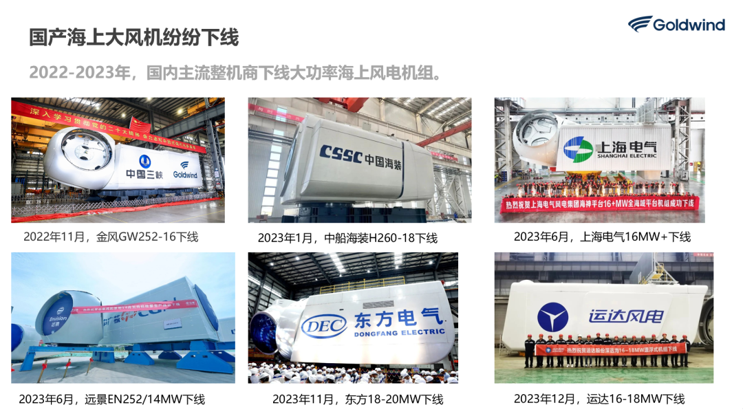 2021年海上风电机组主流已经在6MW到7MW水平,8MW到10MW机组已经投入了试验运行。2022年海上风电机组主流到了8MW左右,10MW到11MW机组已经开始投入运行了。2023年的12-13MW机组达到批量应用, 2022年11月,金风16MW机组下线了,到2023年6月在福建平潭吊装完成,同时2023年中国海装的18MW机组已经下线,明阳的18MW机组也已经下线,10月份明阳的22MW的机组,还有20MW的风电机组都在持续下线。6月5日,由东方电气自主研制的首台18兆瓦半直驱大功率海上风电机组,在广东省汕头市风电临海试验基地成功完成吊装,是当前全球已安装的最大功率等级海上风电装备,标志着全球已安装的海上风电机组功率等级迈入新的里程碑。